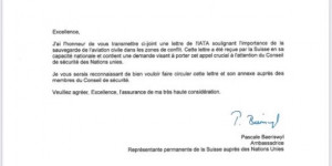 اكد اتحاد النقل الجوي الدولي من خلال رسالة ارسلت الى مجلس الأمن عبر الممثلية الدائمة لسويسرا لدى الأمم المتحدة على أهمية حماية الطيران المدني، وقد تم