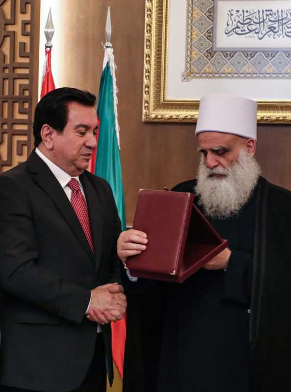 وقدّم الوفد لسماحته درعاً تقديرا لمواقفه الروحية والوطنية الجامعة.