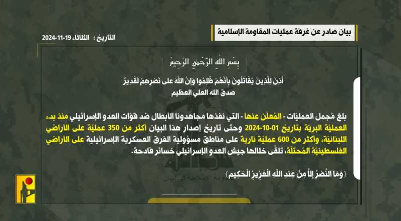 - بلغ مُجمل العمليّات - المُعلن عنها - التي نفذها مجاهدونا الأبطال ضد قوّات العدو الإسرائيلي منذ بدء العمليّة البريّة وحتى تاريخ إصدار هذا البيان أكثر من 350 عمليّة على الأراضي اللبنانيّة، وأكثر من 600 عمليّة نارية على مناطق مسؤولية الفرق العسكرية الإسرائيلية على الأراضي الفلسطينيّة المُحتلّة، تلقّى خلالها جيش العدو الإسرائيلي خسائر فادحة.