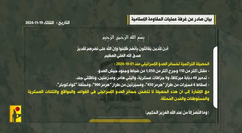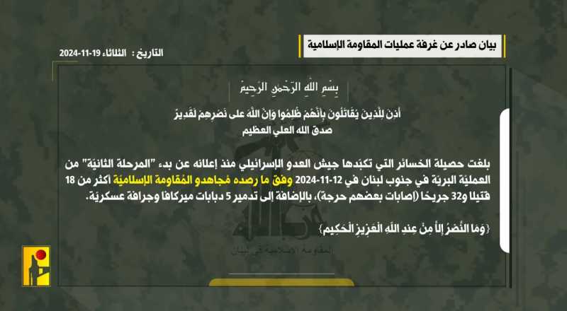 4. خسائر العدو: بلغت حصيلة الخسائر التي تكبّدها جيش العدو الإسرائيلي منذ إعلانه عن بدء "المرحلة الثانيّة" من العمليّة البريّة في جنوب لبنان في 12-11-2024 وفق ما رصده مُجاهدو المُقاومة الإسلاميّة أكثر من 18 قتيلا و32 جريحًا (إصابات بعضهم حرجة)، بالإضافة إلى تدمير 5 دبابات ميركافا وجرافة عسكريّة، لتصبح الحصيلة التراكميّة لخسائر العدوّ الإسرائيلي منذ 01-10-2024 وحتى تاريخ إصدار هذا البيان على الشكل الآتي:
