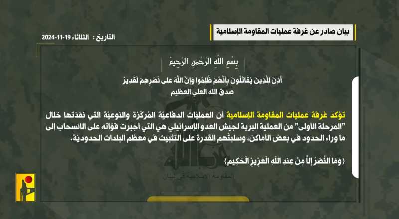 - تؤكد غرفة عمليات المقاومة الإسلامية أن العمليّات الدفاعيّة المُركّزة والنوعيّة التي نفذتها خلال "المرحلة الأولى" من العملية البرية لجيش العدو الإسرائيلي هي التي أجبرت قوّاته على الانسحاب إلى ما وراء الحدود في بعض الأماكن، وسلبتْهم القدرة على التثبيت في معظم البلدات الحدوديّة.