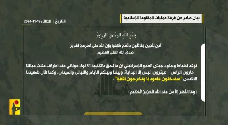 - نؤكد لضباط وجنود جيش العدو الإسرائيلي أن ما لحق بالكتيبة 51 لواء غولاني عند أطراف مثلث عيناثا – مارون الراس – عيترون، ليس إلّا البداية. وبيننا وبينكم الأيام والليالي والميدان. وكما قال شهيدنا الأقدس "ستدخلون عاموديًا وتخرجون أفقيًا".
