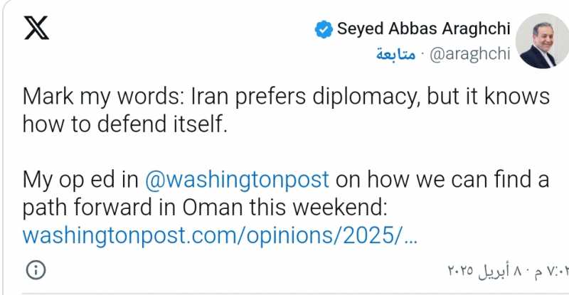 وفي ما يخص المفاوضات المزمع عقدها السبت في سلطنة عُمان، أكد عراقجي أنها ستكون «غير مباشرة»، موضحأ أن «السعي إلى إجراء مفاوضات غير مباشرة» سببه «(أننا) نواجه جداراً كبيراً من عدم الثقة وتساورنا شكوك جدية حول صدق النوايا، ويزيد من سوئها إصرار الولايات المتحدة على استئناف سياسة الضغط الأقصى قبل أي تفاعل دبلوماسي».