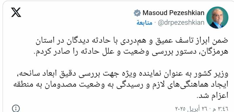 وأعرب الرئيس الإيراني، عبر «أكس»، عن «أسفه العميق وتعاطفه مع ضحايا الحادث الذي وقع في محافظة هرمزغان»، معلناً أنه أمر بـ«إجراء تحقيق في ملابسات الحادث وأسبابه».