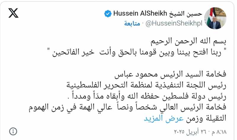 ووفقاً لوكالة «وفا» الرسمية، رشح عباس للجنة التنفيذية «وفقاً لقرار المجلس المركزي الفلسطيني بتاريخ 24 نيسان 2025 في دورته 32، الذي قرر استحداث منصب نائب رئيس اللجنة التنفيذية لمنظمة التحرير الفلسطينية، نائب رئيس دولة فلسطين وتعيينه (...) السيد حسين شحادة محمد الشيخ، لهذا المنصب».