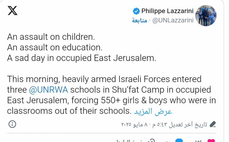 من جهته، قال المفوض العام لـ«الأونروا»، فيليب لازاريني، عبر «إكس»، إن «إغلاق السلطات الإسرائيلية مدارس للفلسطينيين تديرها الوكالة في القدس الشرقية المحتلّة، هو اعتداء على الأطفال».