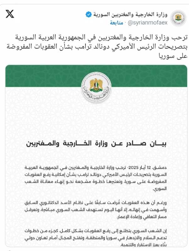 بدورها، رحبت وزارة الخارجية السورية بتصريحات ترامب، معتبرةً أنها «خطوة مشجعة نحو إنهاء معاناة الشعب السوري».