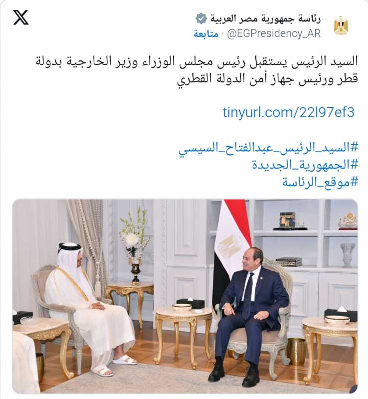 وكان الرئيس المصري، عبد الفتاح السيسي، التقى في القاهرة اليوم، رئيس مجلس الوزراء، وزير الخارجية القطري، محمد بن عبد الرحمن بن جاسم آل ثاني، بحضور رئيس المخابرات العامة المصرية اللواء حسن رشاد، ورئيس جهاز أمن الدولة القطري خلفان الكعبي.