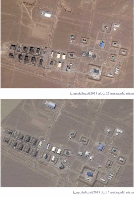 ونشرت الوكالة، اليوم، صوراً مقدمة من موقع «Planet Labs PBC»، تظهر مصنع شاهرود للوقود الصلب الإيراني، الواقع خارج مدينة شاهرود، إيران، بعد العدوان الإسرائيلي في 25 حزيران 2025، قارنتها مع صورة أخرى التُقطت في 5 أيلول من الشهر الحالي، تُظهر جهود إعادة بناء المصنع.