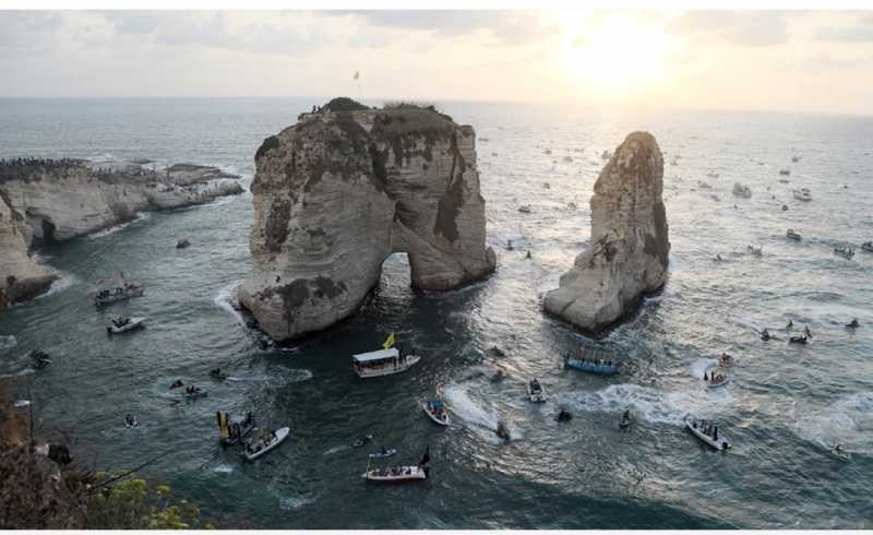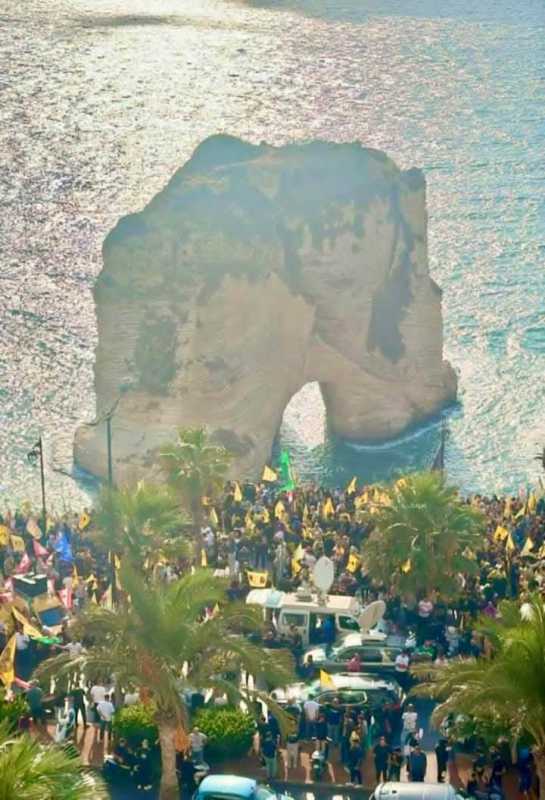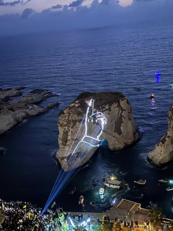 من جهة المنارة وقريطم والرملة البيضاء، وعلى مدى ساعات، لم تتوقّف المسيرات التي أدّت إلى إغلاق المنطقة ومحيطها، فيما تمركزَ الجموع في نقاط عديدة على الأرض وشرفات المنازل المطلّة على صخرة الروشة وفي المقاهي الموجودة في المكان، حاملين أعلام حزب الله وأعلام أحزاب حليفة للمقاومة، من بينها أعلام حركة أمل والحزب السوري القومي الاجتماعي. كما سُجّل انتشار كبير للقوى الأمنية.