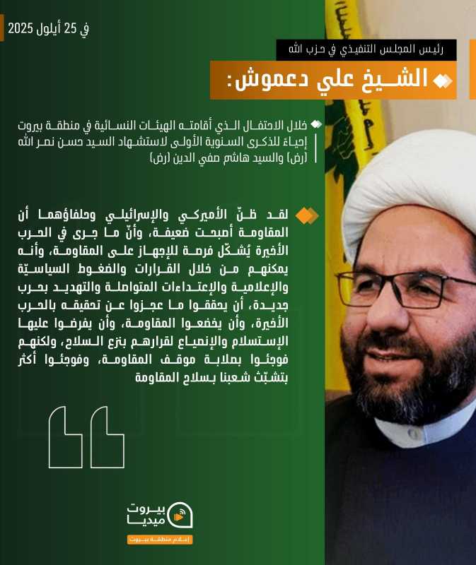 لقد ظنّ الأميركي والإسرائيلي وحلفاؤهما أن المقاومة أصبحت ضعيفة، وأنّ ما جرى في الحرب الأخيرة يُشكّل فرصة للإجهاز على المقاومة، وأنه يمكنهم من خلال القرارات والضغوط السياسيّة والإعلامية والإعتداءات المتواصلة والتهديد بحرب جديدة، أن يحققوا ما عجزوا عن تحقيقه بالحرب الأخيرة، وأن يخضعوا المقاومة، وأن يفرضوا عليها الإستسلام والإنصياع لقرارهم بنزع السلاح، ولكنهم فوجئوا بصلابة موقف المقاومة، وفوجئوا أكثر بتشبّث شعبنا بسلاح المقاومة.