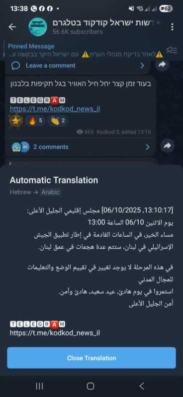 يوم الاثنين 06/10 الساعة 13:0، في الساعات القادمة، في إطار تطبيق الجيش الإسرائيلي في لبنان، ستتم عدة ضربات في عمق لبنان.