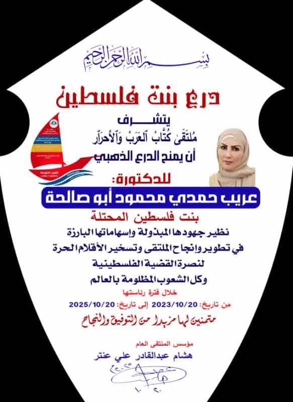 بكلِّ إجلالٍ واعتزازٍ، نتشرَّفُ بتسليمِ دِرعِ ملتقى كُتّابِ العربِ والأحرارِ الذَّهبيِّ إلى المناضلةِ المجاهدةِ الدكتورةِ عُريبِ أبو صالحة، بنتِ فلسطينَ المحتلَّة، تقديرًا لجهودِها المبذولةِ في نجاحِ الملتقى، وإسهامِها ودورِها البارزِ والفعّالِ في تشجيعِ الكُتّابِ والكاتباتِ على دعمِ القضيّةِ الفلسطينيّة، ومظلوميّةِ كلِّ الشعوبِ المستضعفة، ونشاطِها المستمرِّ خلالَ فترةِ رئاستِها من تاريخ 20/10/2023م إلى تاريخ 20/10/2025م.