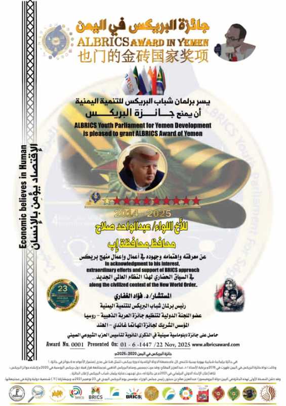 اللواء عبد الواحد صلاح محافظ اب الرجل الاول في المحافظة وممثل رئيس الجمهورية في المحافظة يتم منح جائزة البريكس لعام 2025من الدكتور فؤاد الغفاري ممثل دول البريكس ومؤسس جائزة البريكس في اليمن الف الف مبروك للاخ اللواء عبد الواحد صلاح محافظ اب يستحقها بجدارة لانه رجل السلام الاول في المحافظة وقاد المحافظة في أصعب المحطات التاريخية الى بر الامان الف الف مبروك ونتمنى له التوفيق