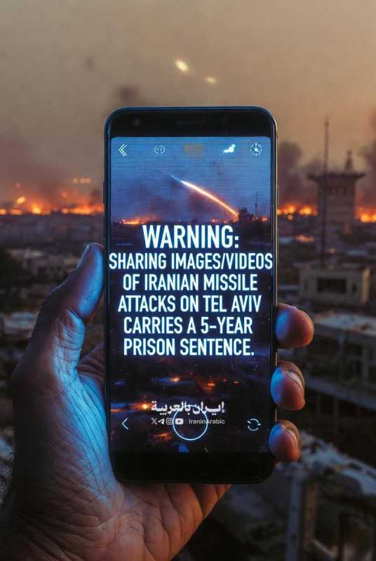 إسرائيل فرضت قانونًا طارئًا يقضي بالسجن لمدة تصل إلى 5 سنوات على أي شخص ينشر صورًا أو مقاطع فيديو لهجمات صاروخية إيرانية على تل أبيب
