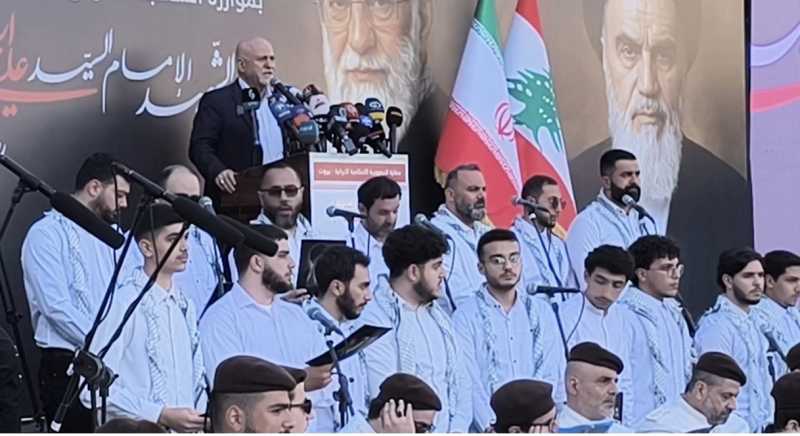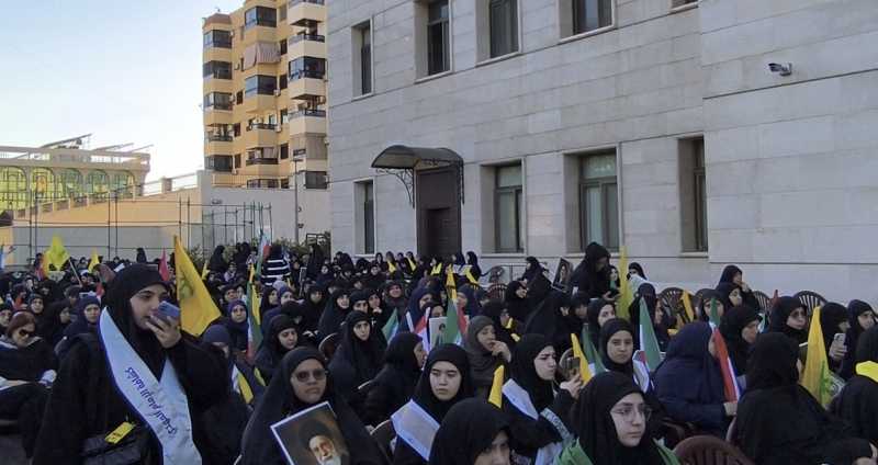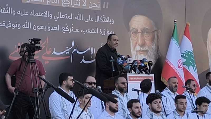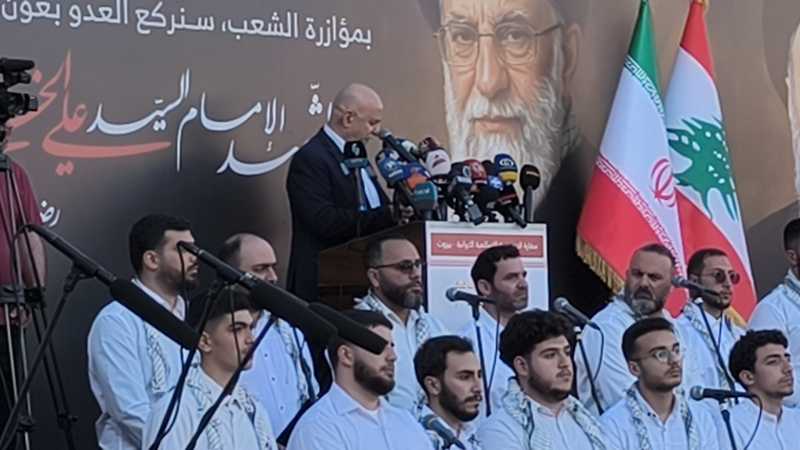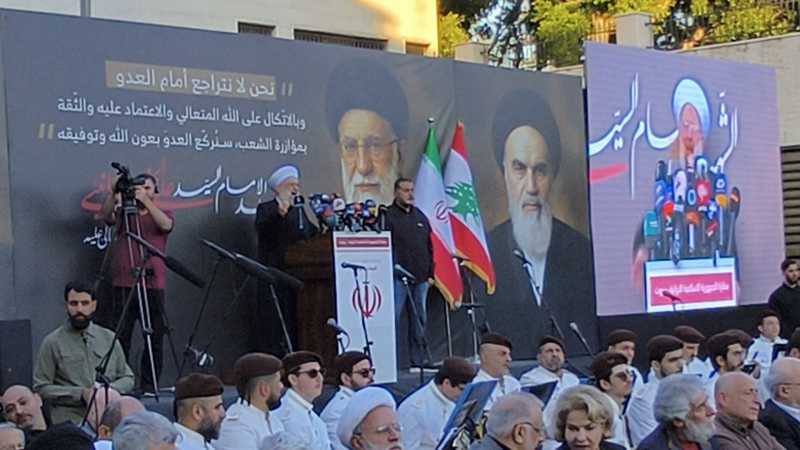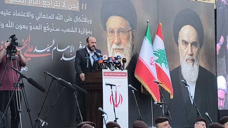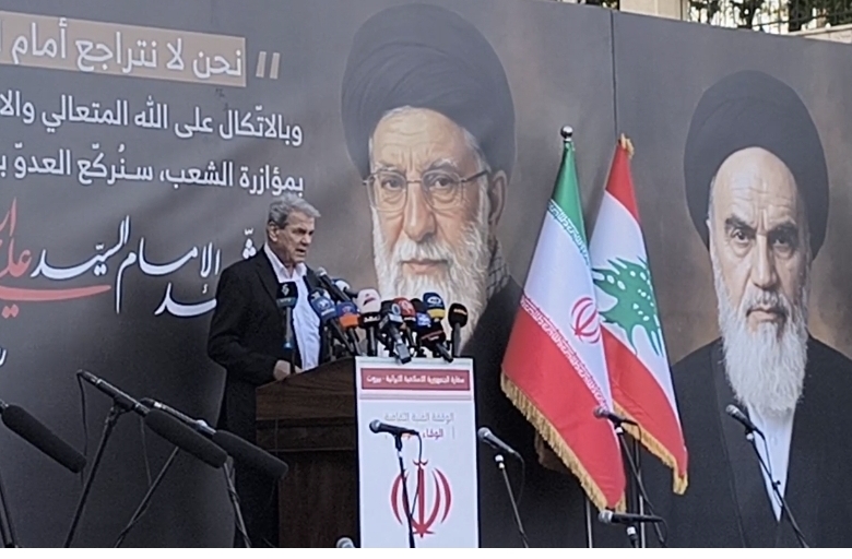 توفيق الصمدي القائم باعمال السفارة الايرانيه في بيروت شكر الحضور على تضامنهم ووفائهم ووعد باستمرار قوفي جمهوريه الاسلامية الايرانية الى جانب الشعوب المستضعفة والمقاومة في وجه العدوان الامريكي الاسرائيلي الصهيوني