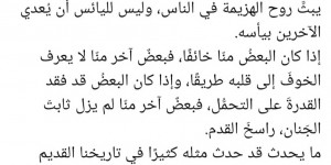 المؤمن بالله، لا ينهار عند خذلان الناس له، فسيعوضه الله عَمَّن يخذله بمن يصدق معه.ولا يفقد الأمل عند انقطاع الأسباب، فمالك الأسباب كلها هو الله، والله