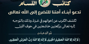 كتائب الشهيد عز الدين القسام تدعو أبناء أمتها للتضرع إلى الله تعالىلكشف الكرب عن إخوانهم في غزة، وذلك بالتوجه إليه تعالى بركعتين خاشعتين في جوف الليلث