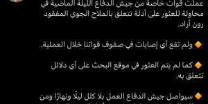 المتحدث باسم جيش الابادة الإسرائيلي": عملت قوة خاصة في لبنان بهدف البحث عن رفات رون أراد، القوة لم تنجح في المهمة ولم تعثر على شيء.القناة 15 العبرية: